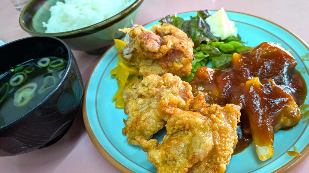 安定の満席(-_-;)5人掛の円卓に…オジサンが3人で相席食堂です(-_-;)
