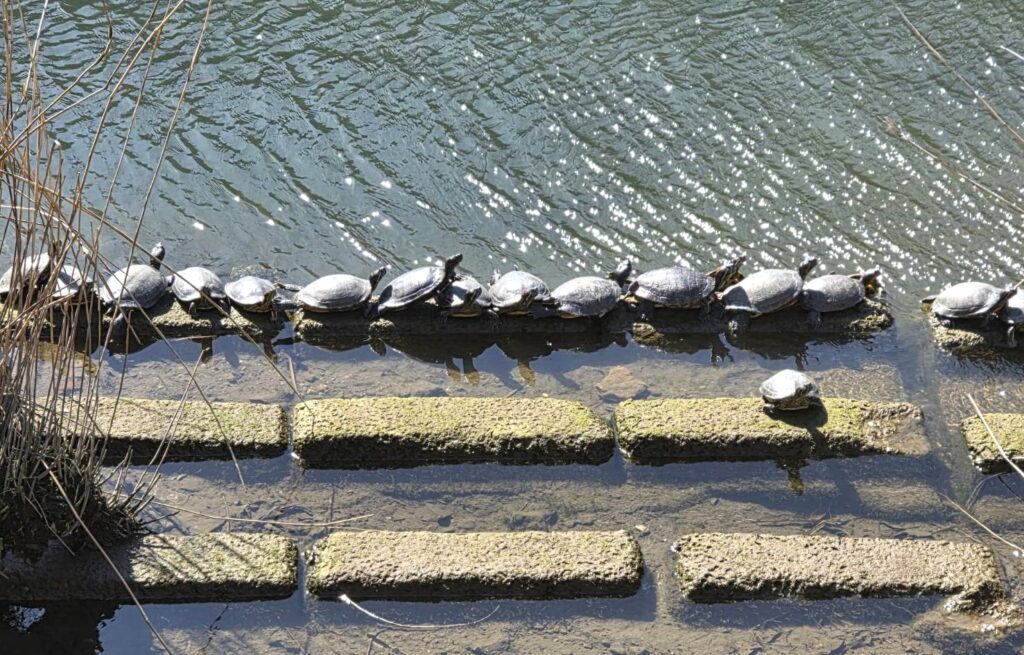 …カモや…カメが…大量に日向ぼっこしてる(^.^)…
