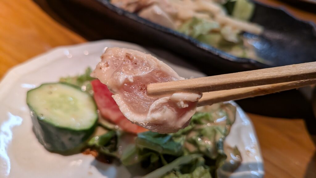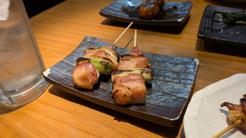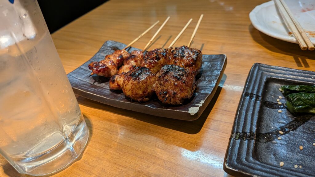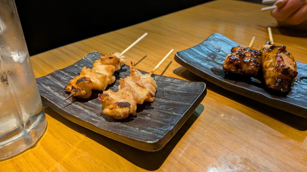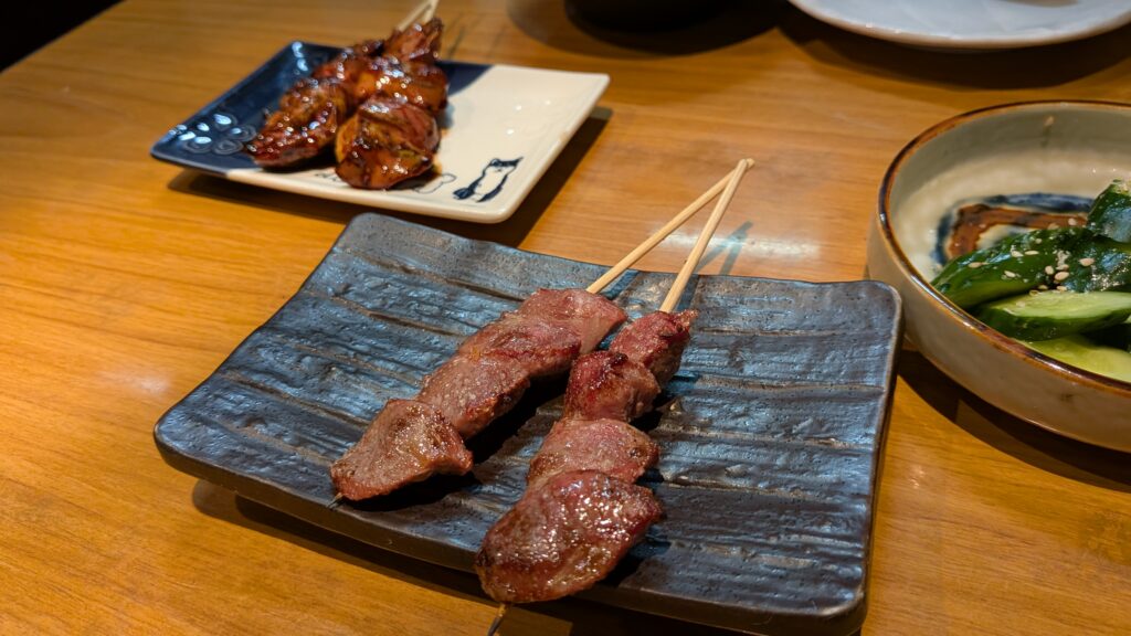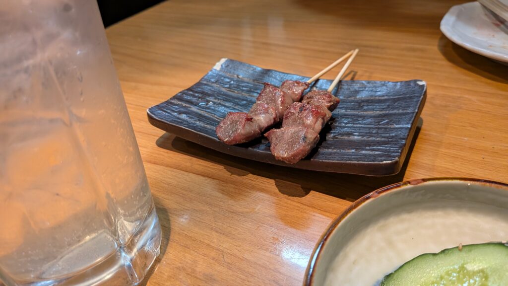 おまかせ“鶏串”が3本付きます(^.^)…↑↑鶏レバーと砂肝ですな(^.^)火が通し過ぎずレア感が多めで(^.^)旨いです(^.^)